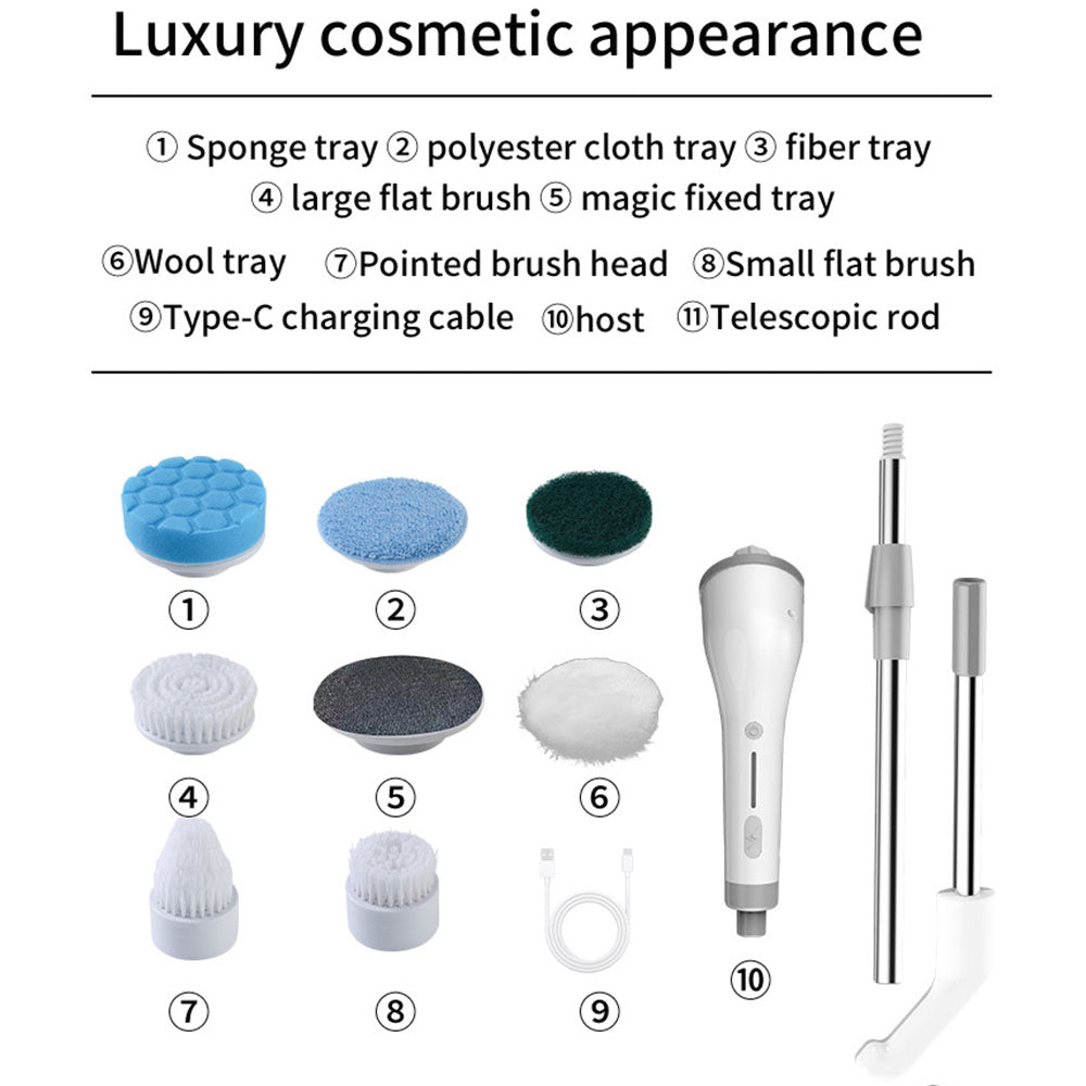 Livrée avec 7 têtes de brosses différentes, la Sunshine Electric Brush s’adapte à tous vos besoins : une brosse douce pour les surfaces délicates (comme les baignoires pour bébé 👶), une brosse dure pour les joints ou les carreaux 🧱, une éponge pour les vitres et les surfaces lisses, et une brosse conique pour les coins difficiles d’accès 🚿. Chaque tête se fixe et se retire facilement d’un simple geste.